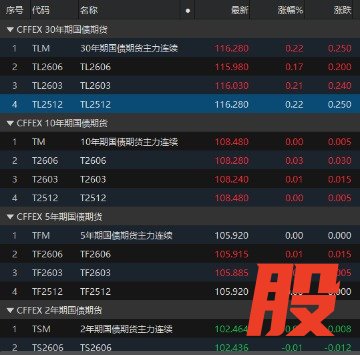 上证报中国证券网讯 11月10日,国债期货早盘收盘,30年期主力合约涨0.22%,报116.280元,10年期主力合约持平,报108.480元,5年期主力合约持平,报105.920元,2年期主力合约跌0.01%,报102.464元。