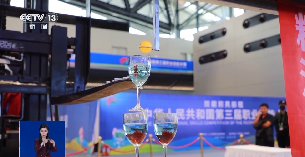 刘雅洁来自山东,她的绝活是驾驶2吨的叉车摞放四层高脚酒杯。为了增加难度,每个酒杯内装着水和一条金鱼。同时在最高的位置还放置了一枚乒乓球。